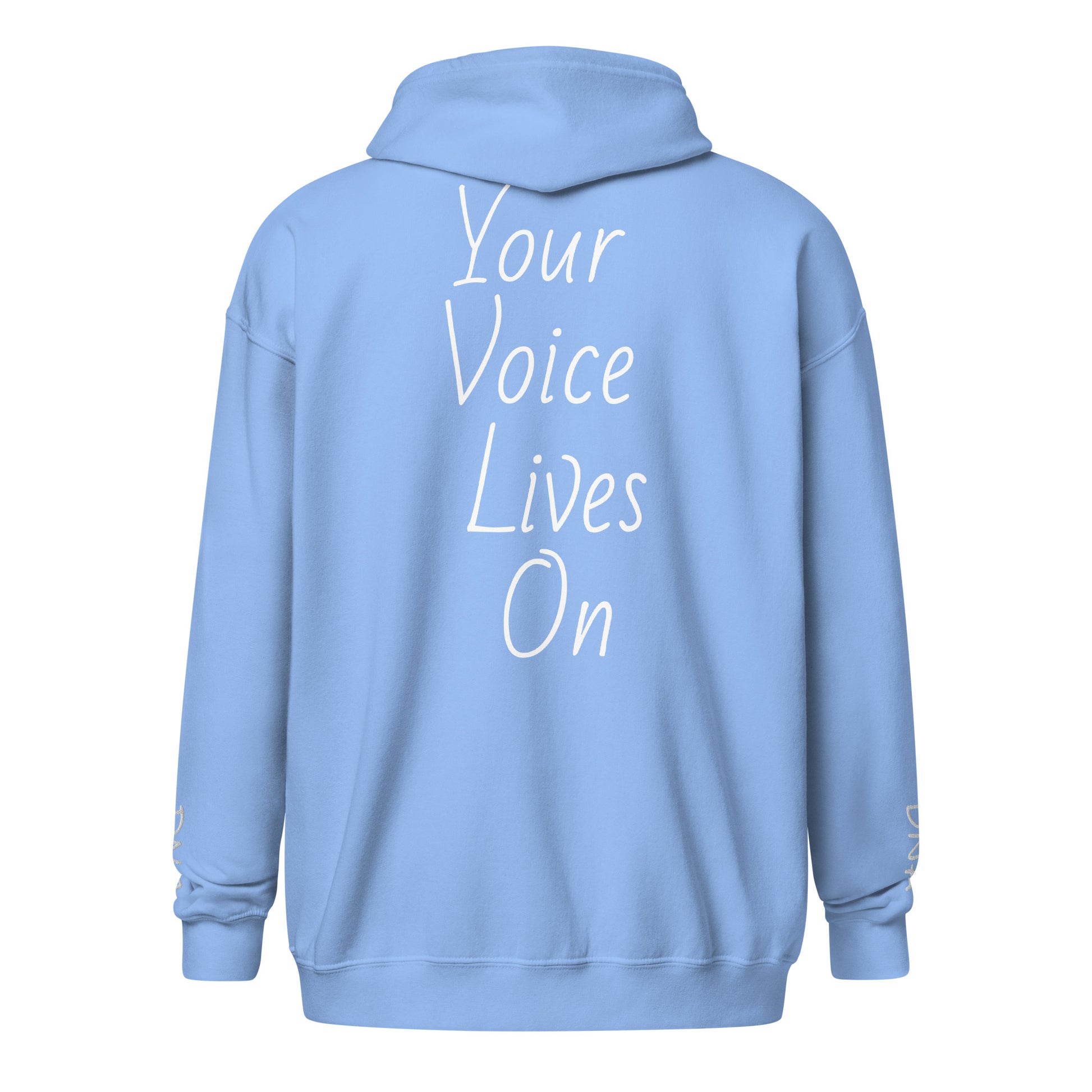 Design thought of by my sister and I. Blue with white lettering to signify the sky/heaven. With lyrics from the song "in-my-dna" that was written about my mom who passed in 2020. Loved ones who pass aren't physically here anymore. But their voice lives on in our DNA.